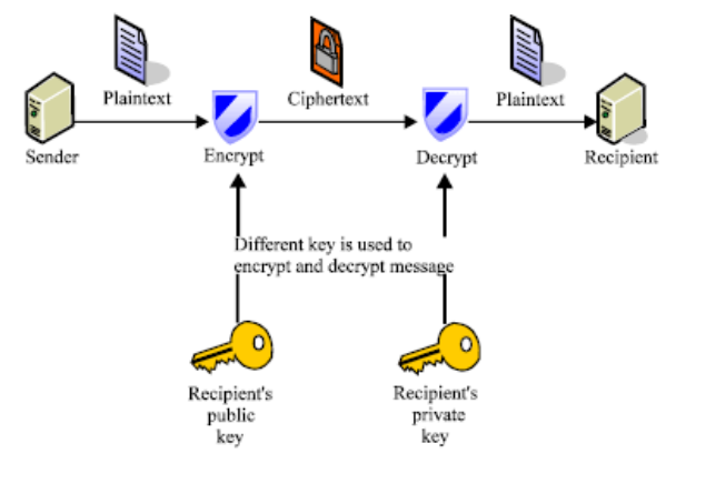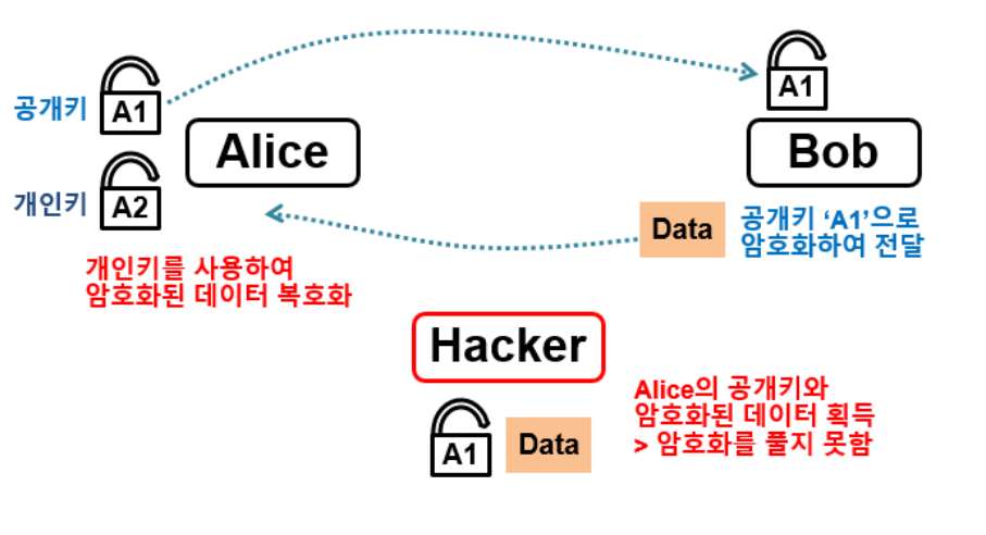 - 수학적 알고리즘을 통해 암호화를 위한 키와 복호화를 위한 키를 따로 가지는 암호 알고리즘이다.