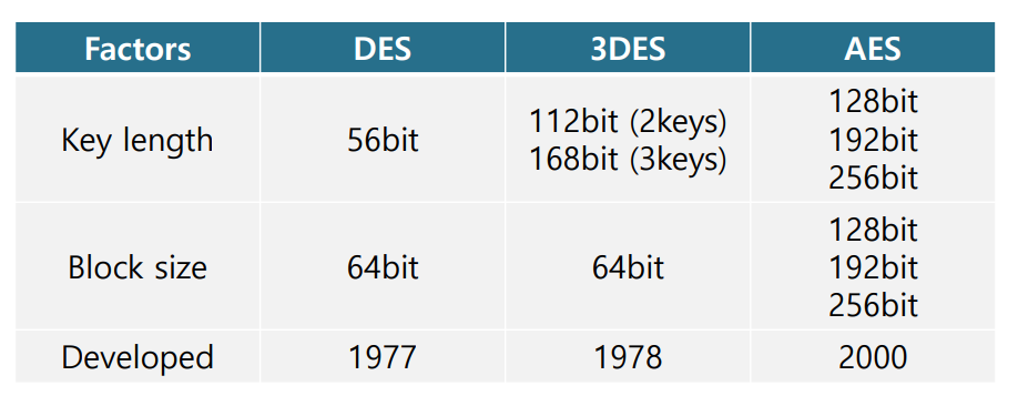 - 단점 : 키교환이 어렵다, 안정성이 낮다