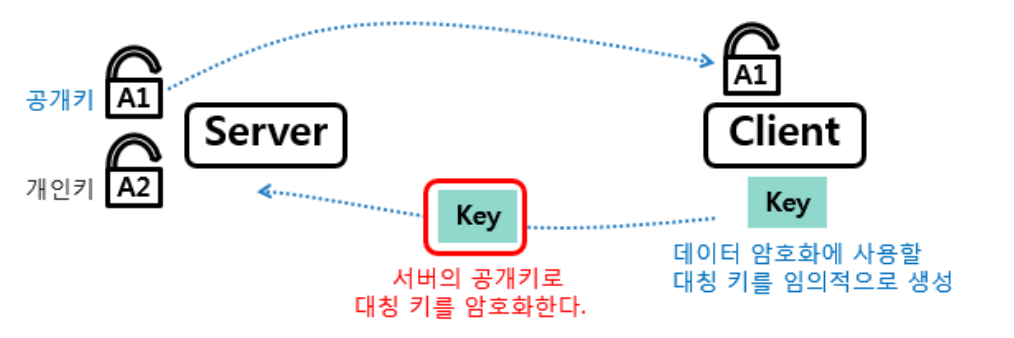 - 비밀키(대칭키)를 안전하게 전송하기 위해 비 대칭 암호화 알고리즘을 사용하는 방식이다.