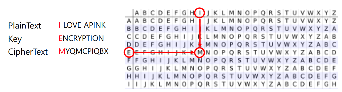 - 단일치환 방식의 단점을 보완한 대표적인 다중치환 알고리즘으로 16세기 Vigenere가 고안한 암호 기법이다.